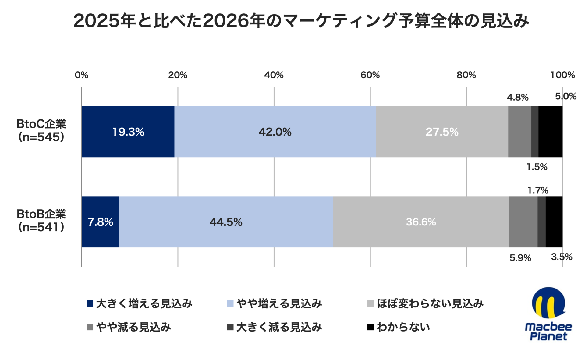 BtoC企業では投資拡大の意向が強まる一方、BtoB企業では予算の最適化が進むという、明確な差が浮かび上がりました。