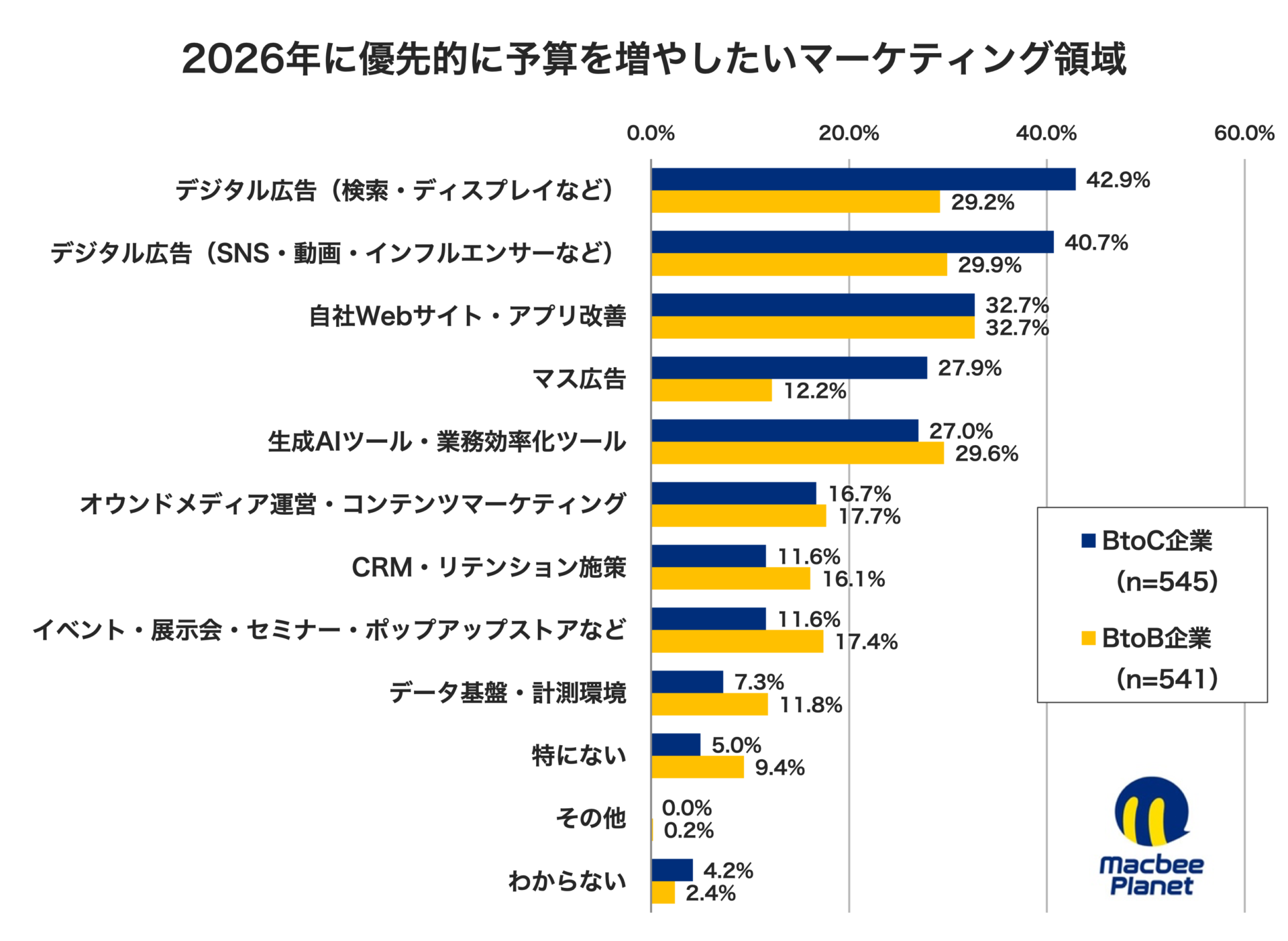 結果、2026年の予算は、BtoC企業で約6割、BtoB企業で約5割が“増える見込み”と回答。また、優先的に増やしたい予算としては、BtoC企業で「デジタル広告」全般が支持されたのに対し、BtoB企業では「自社Webサイト・アプリ改善」と「生成AIツール・業務効率化ツール」が約3割に上ることが判明。