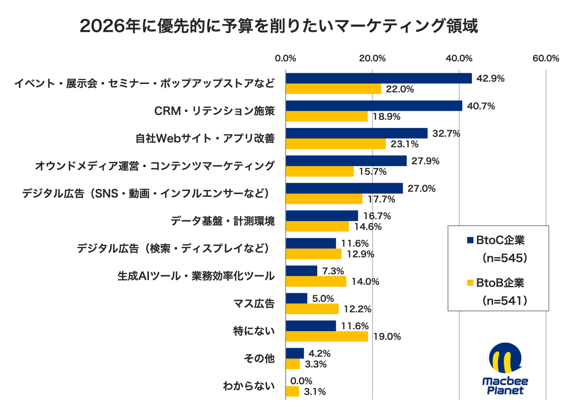 マクビープラネットでは、「マーケティング担当者1,086名を対象に、2026年の“投資シフトマップ”に関する実態調査」を実施しました。この調査は、2025年から2026年にかけて、どの領域の予算を「増やす/維持する/削る」のかを、BtoB企業とBtoC企業の違いに着目しながら可視化したものです。